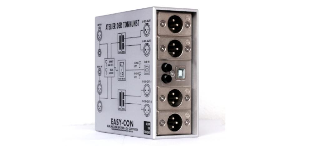 Easy-Con ist ein Stereo Split- und Isolationstool für Linesignale. Alternativ zu analogen Audiosignalen können auch digitale Signalquellen via USB angeschlossen und gewandelt werden.